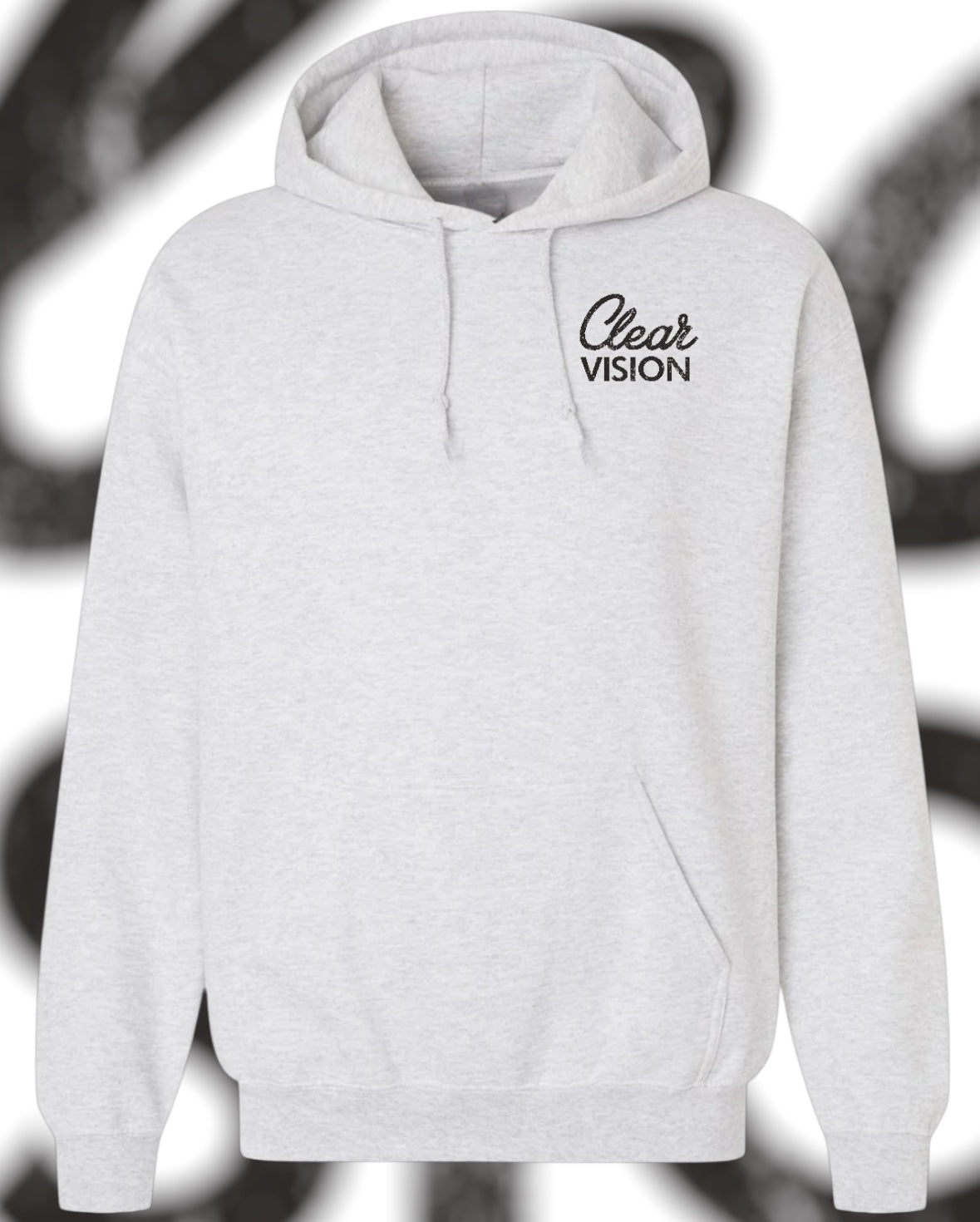 Crafted on an Oatmeal Heather hoodie, this piece features a distressed black print for a worn-in, timeless feel. The front showcases a clean Clear Vision chest logo, while the back delivers the message loud and clear: